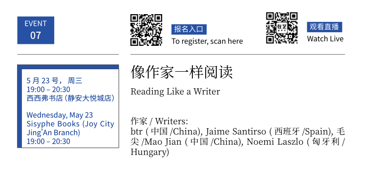 23 de mayo de 2018: ‘Reading Like a Writer’ — II EU-China International Literary Festival (Sisyphe Books Jing’An, Shanghái, China). Con Noemi Laszlo, Mao Jian, btr y Shelly Bryant.
