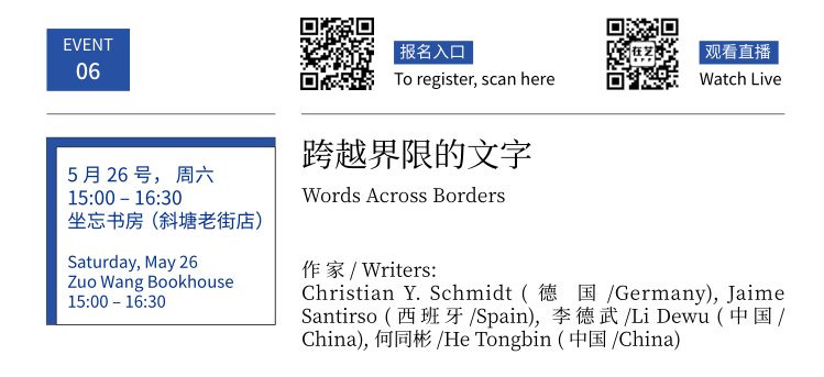 26 de mayo de 2018: ‘Words Across Borders’ — II EU-China International Literary Festival (Zuo Wang Bookhouse, Suzhou, China). Con Christian Schmidt, Li Dewu and He Tongbin.