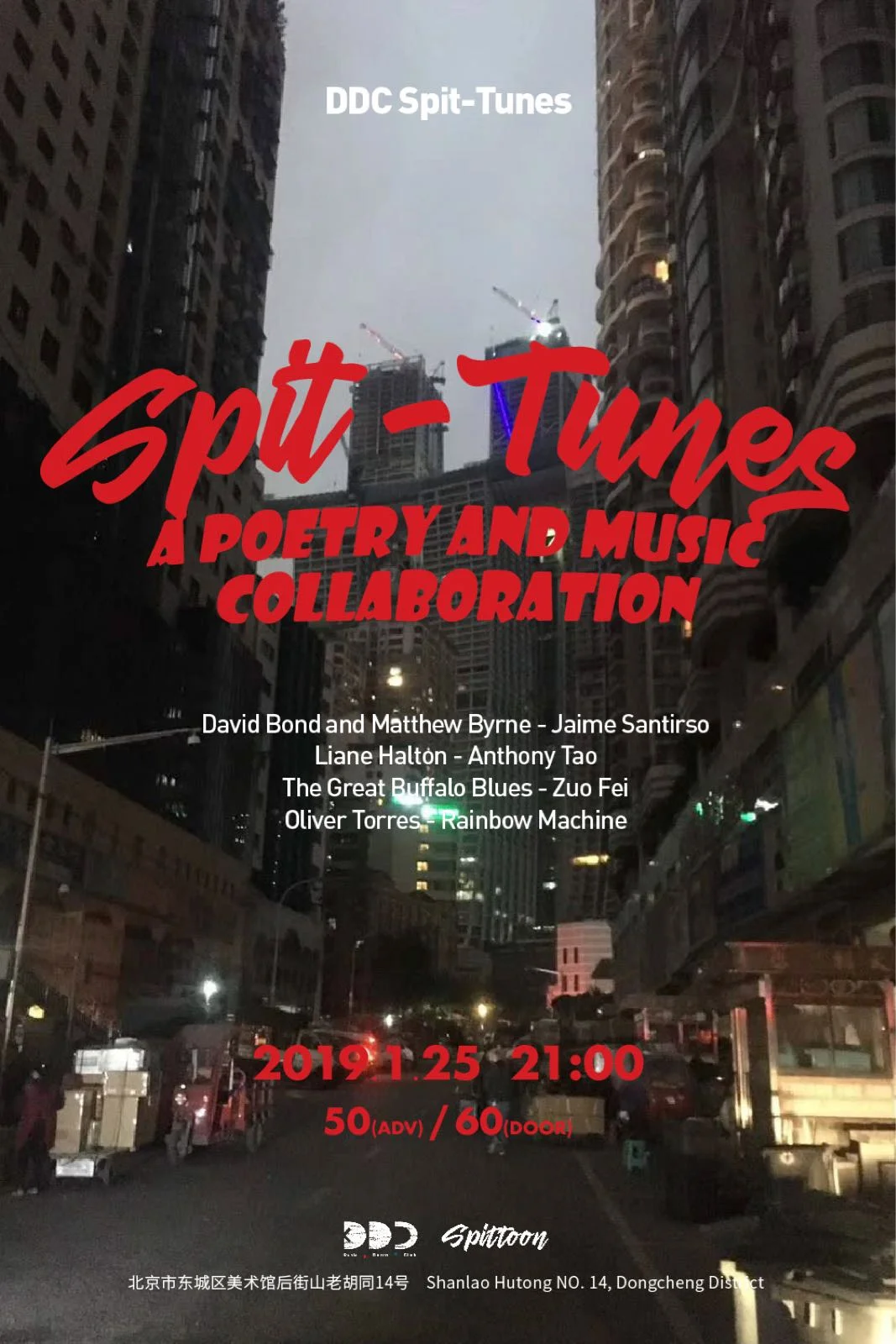 25 de enero de 2019: Jaime Santirso x Bond&Byrne — Spittunes (Dawn Dusk Club, Pekín, China). Interpretación de poesía y música junto a David Bond (piano) y Matthew Byrne (batería).