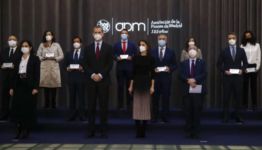 9 de febrero de 2021: Entrega de los premios de la Asociación de la Prensa de Madrid 2019 y 2020 (Palacio de Cibeles, Madrid, España). Acto presidido por SSMM los Reyes de España.